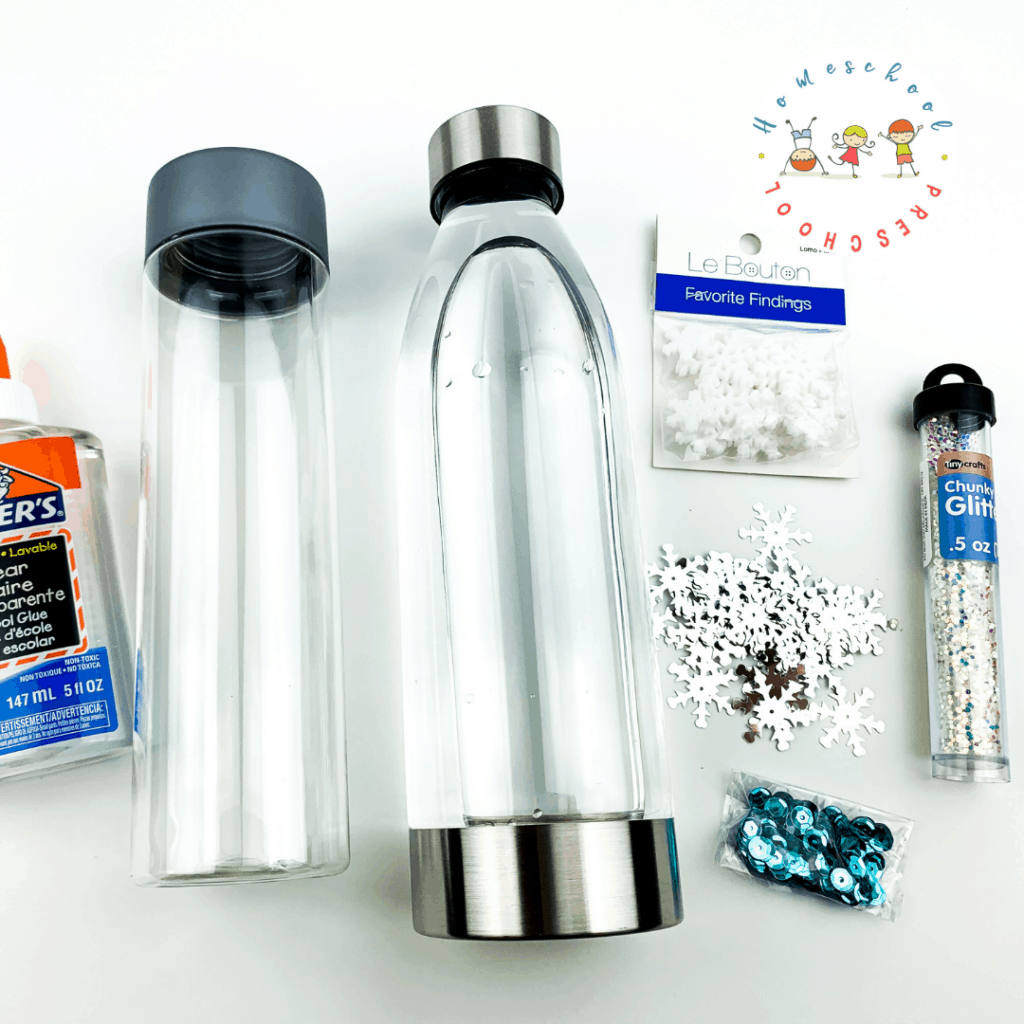 Materials: Clear bottle, water, glitter, snowflakes, glue