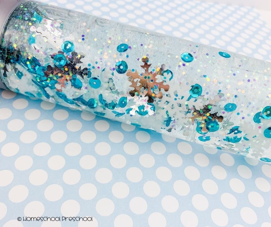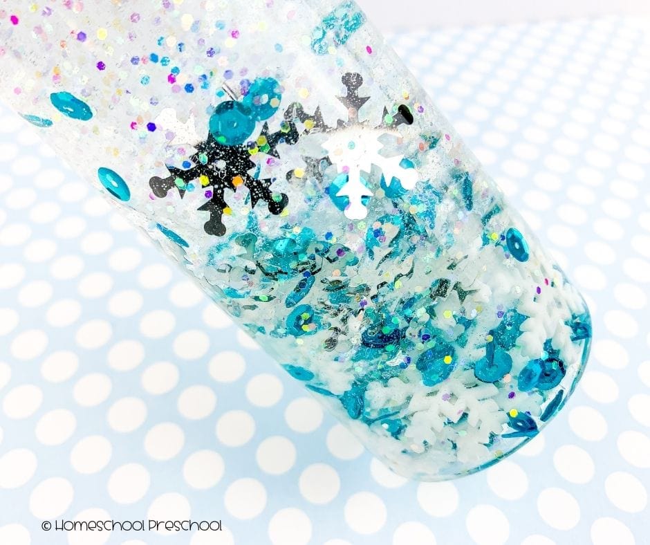 Sensory bottles are easy to make, and they provide hours of calming fun for little ones. This bottle is full of colorful snowflakes, making it perfect for your preschool winter activities.