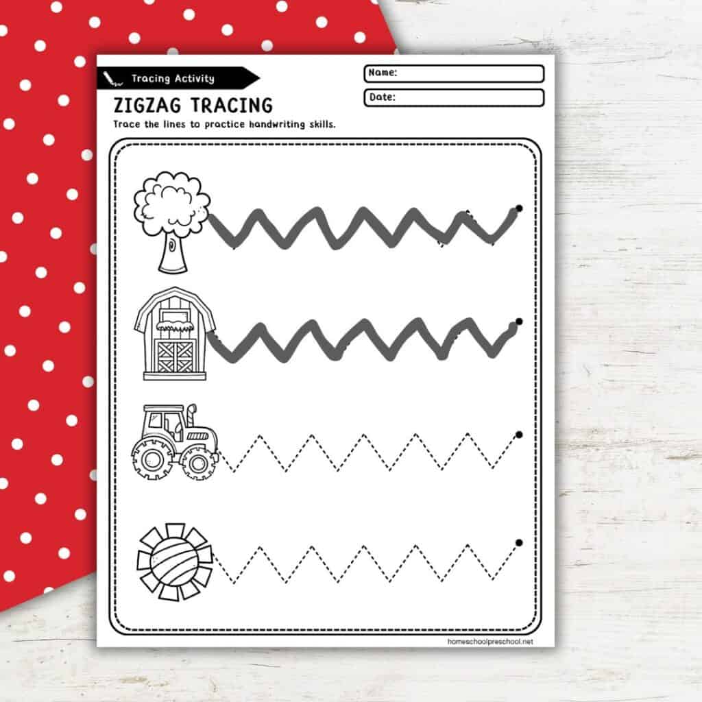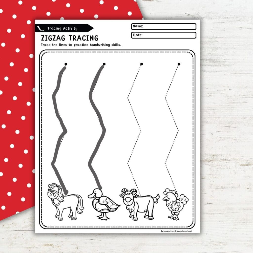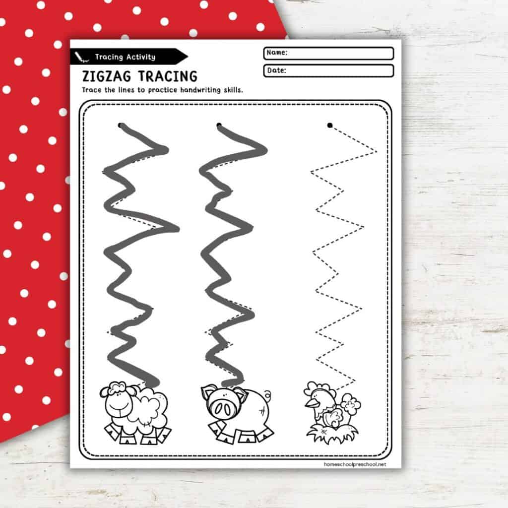 - Zigzag tracing pages – Kids will trace a variety of zigzag patterns to strengthen pencil grip and control