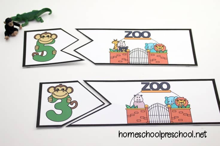 These counting puzzles are so much fun! Have your kids identify the number the monkeys are holding. Then, match them to the zoo with the same number of animals.